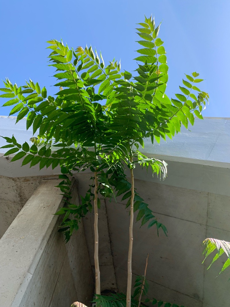 最近名前を覚えた木、シンジュ。ゾロっと長い葉を振り乱したスタイルがトレードマーク。