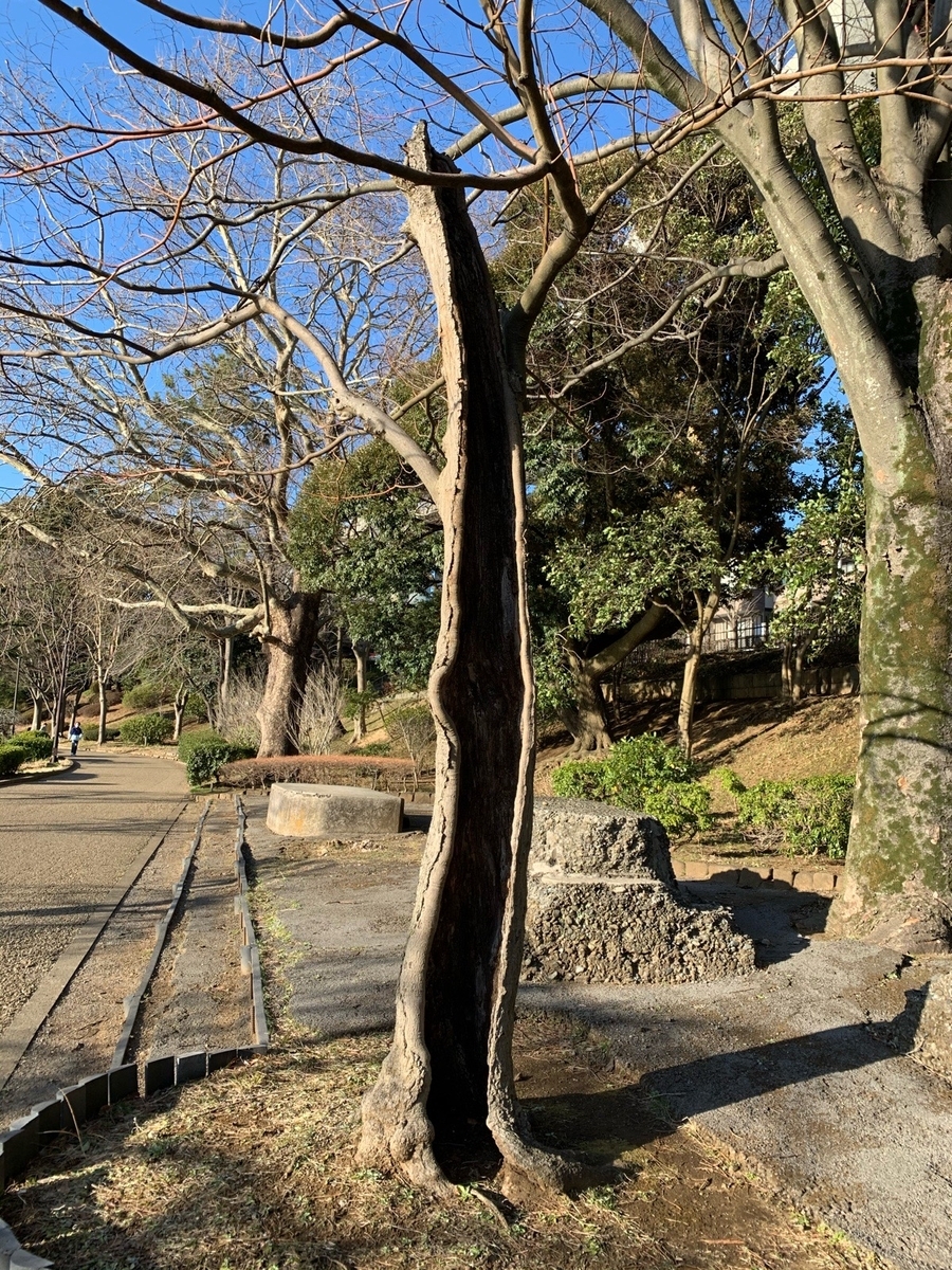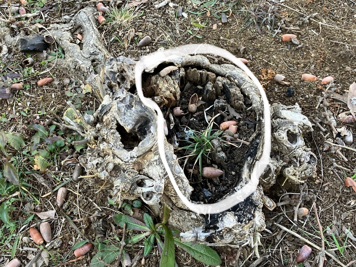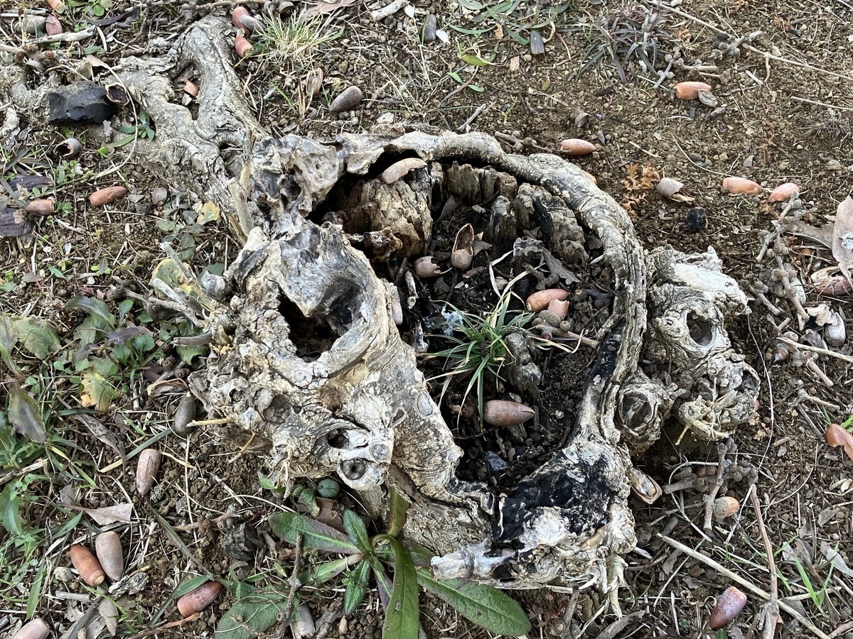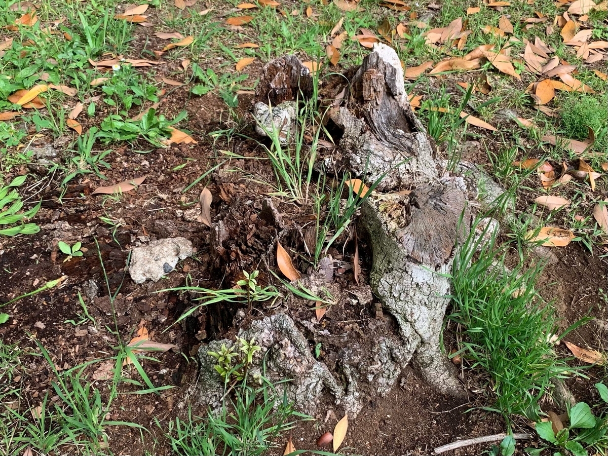 形を失いつつあるマテバシイの切り株を見つけた。幹は朽ち、平らな部分がない。公園内の木で、切られてから何年も経つのだと思う。