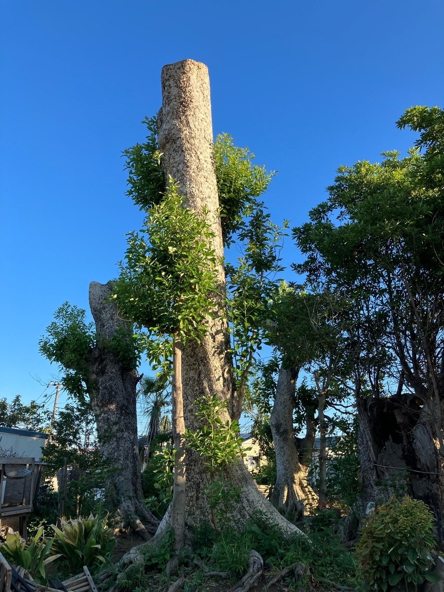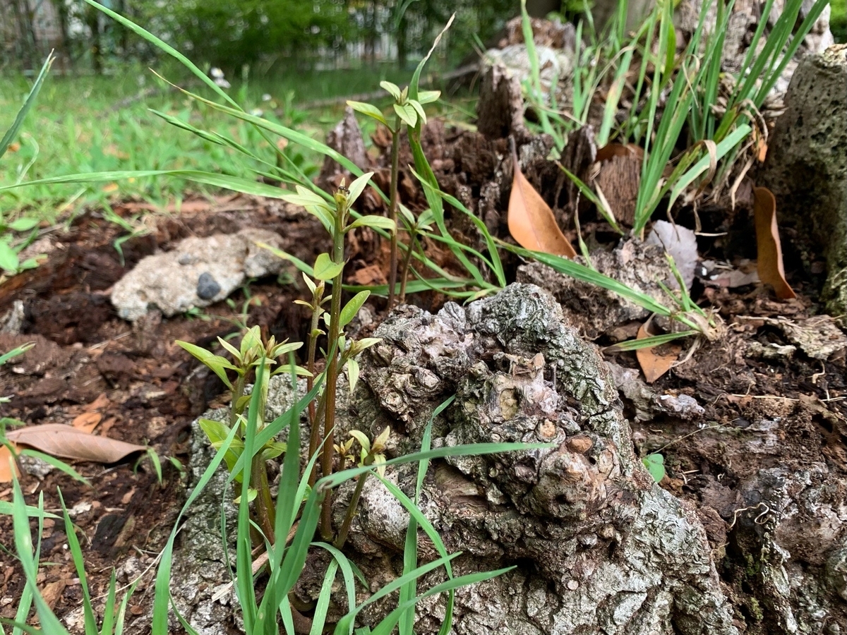 外輪山のように残った根もと部分は生きており、ひこばえが生えていた。