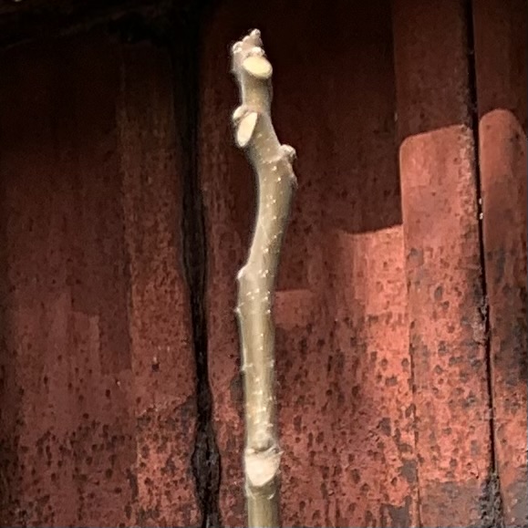 大きな白い葉痕が冬のトレードマーク。枝をナイフでそぎ落としたような独特な形をしており、この姿の方が一目でシンジュだと識別しやすい。葉がある時期よりも落葉した時期の方が個性的に見える、珍しい木だ。