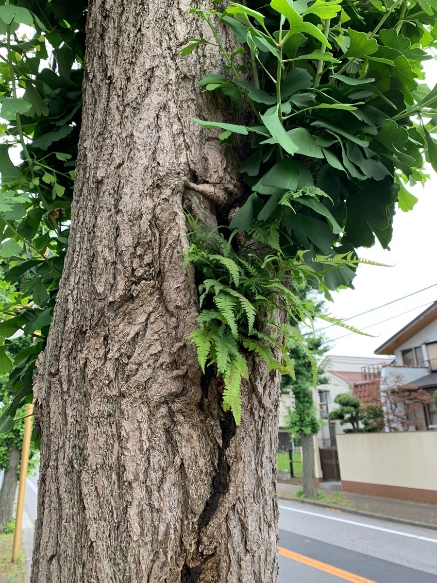 種類はイヌワラビとイノモトソウの仲間のようだ。うろに土が溜まるなどして天然の植木鉢になっている。イチョウが強剪定されているために日当たりがよくなっているのは、ちょっと皮肉な話に思える。