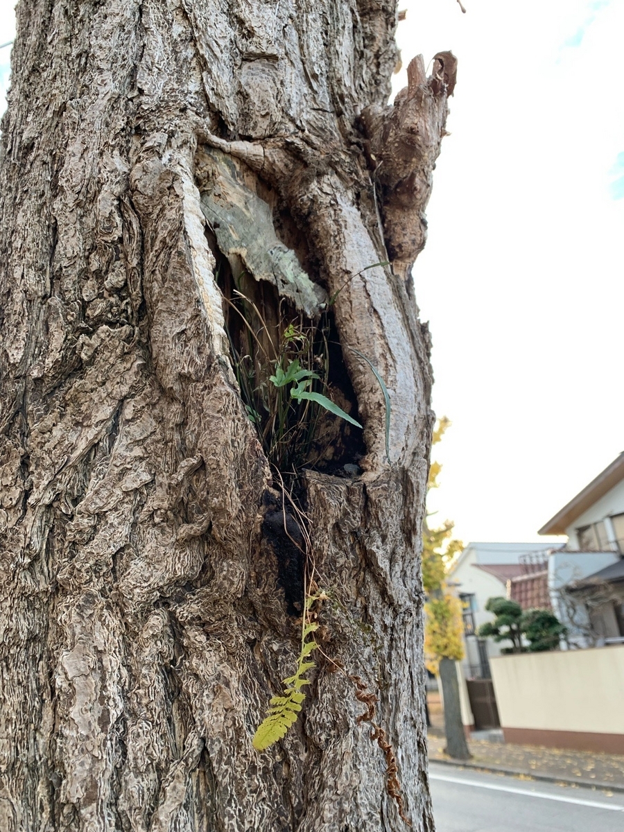 このイチョウのうろ(樹洞)にはシダが生えている。