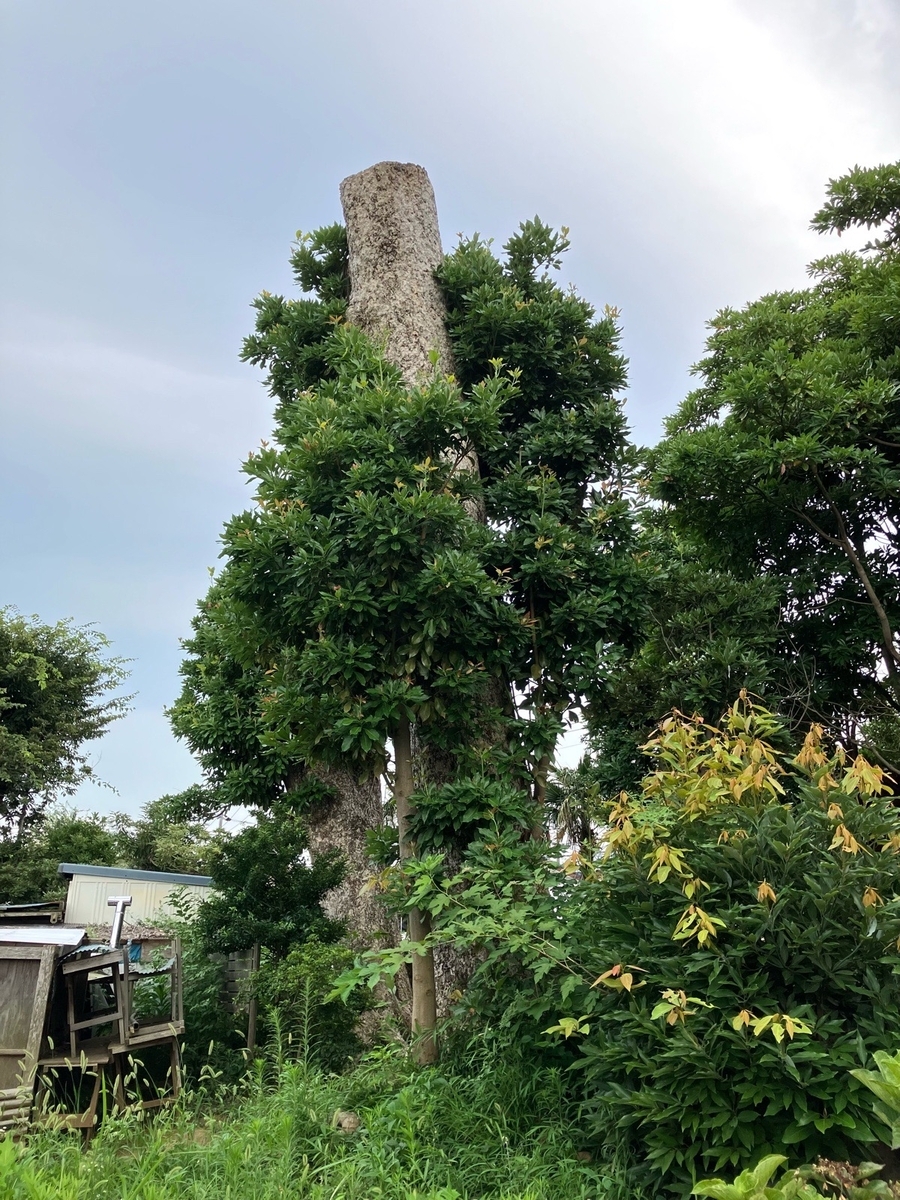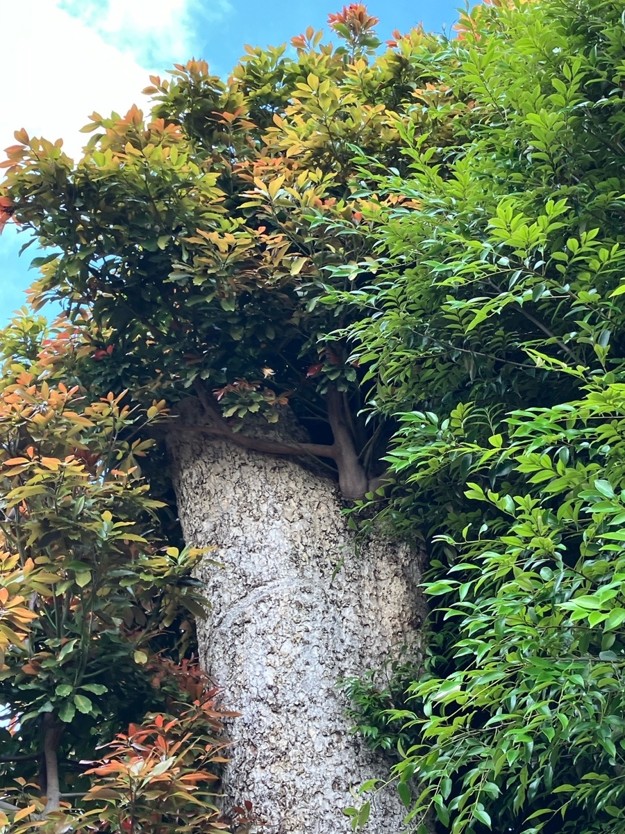 先月枯れていないか恐る恐る再訪すると、巨木たちは生存していた。失った光合成量を取り戻すべく胴吹き芽を展開している。これは一枚目の写真と同じタブノキ。