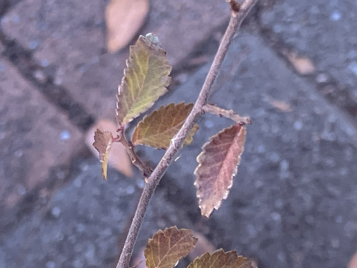 一月下旬のこと。電柱の支線の根もとに生えたムクノキを見つけた。