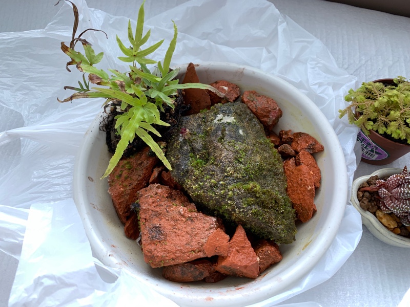 苔の石を少しアレンジすることにしました。イノモトソウを植えています。これからもっとシダを足していく予定です。苔はやはり、他の植物が風を遮る方がいいように思うのです。シダや苔、カタヒバが生い繁るところを想像すると心が落ち着いてきます。