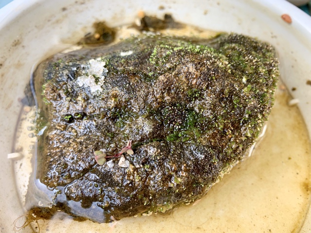 八月に器を替えた後、てっぺんが傷んでしまいました。乾燥と暑さによるダメージです。まだ回復しきってはいませんが、苔石全体の佇まいは器(伊羅保焼のお皿)に馴染んできているのではないでしょうか。