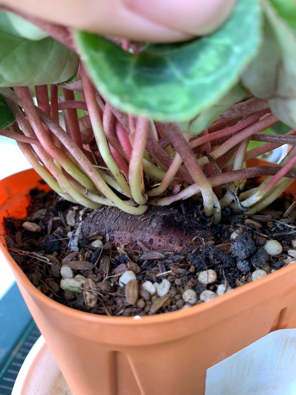 シクラメンの花期はそろそろ終了で、これから夏越しを迎えます。ねぎらいつつ塊茎の様子を見てみした。