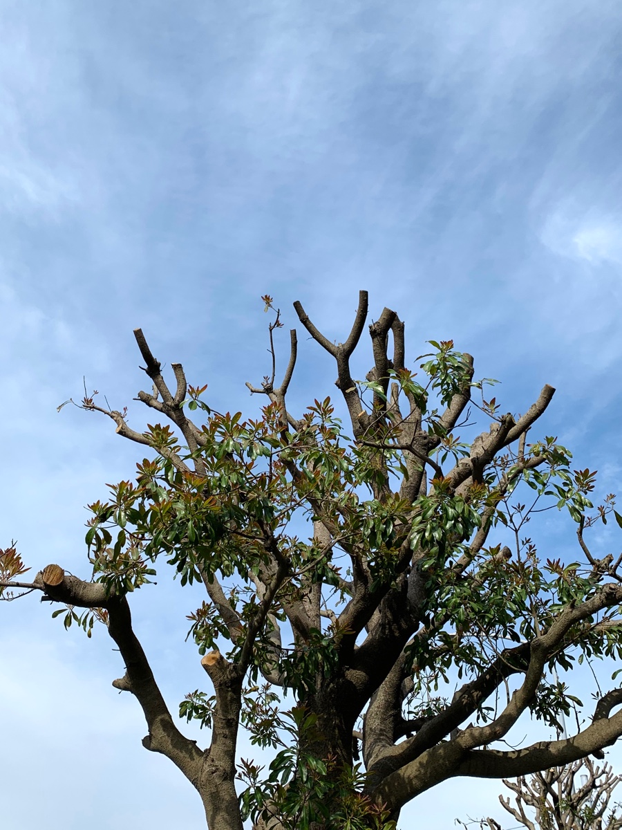 道路沿いに数十本のヤマモモが植栽されています。春までは枝葉が繁ってモコモコでしたが、剪定でスカスカになりました。枝の断面はまだ白く、生々しさが残っています。先月末に花が咲いていましたが、枝ごと剪定されたようなので今年は実はならないでしょう。赤いベリー型の実を見られないのは少し残念ですが、実をつけない年があると樹にとって休憩になります。