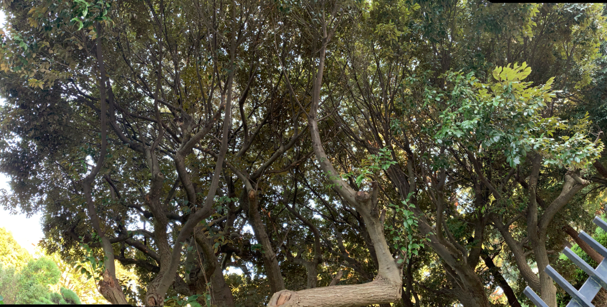 成長したシイはブロッコリーのような樹形です。遠くからでも見分けられますが木陰に入るとより特徴が際立ちます。枝葉のボリューム感をお伝えしたいので、パノラマ機能を使い公園のスダジイを撮影しました。