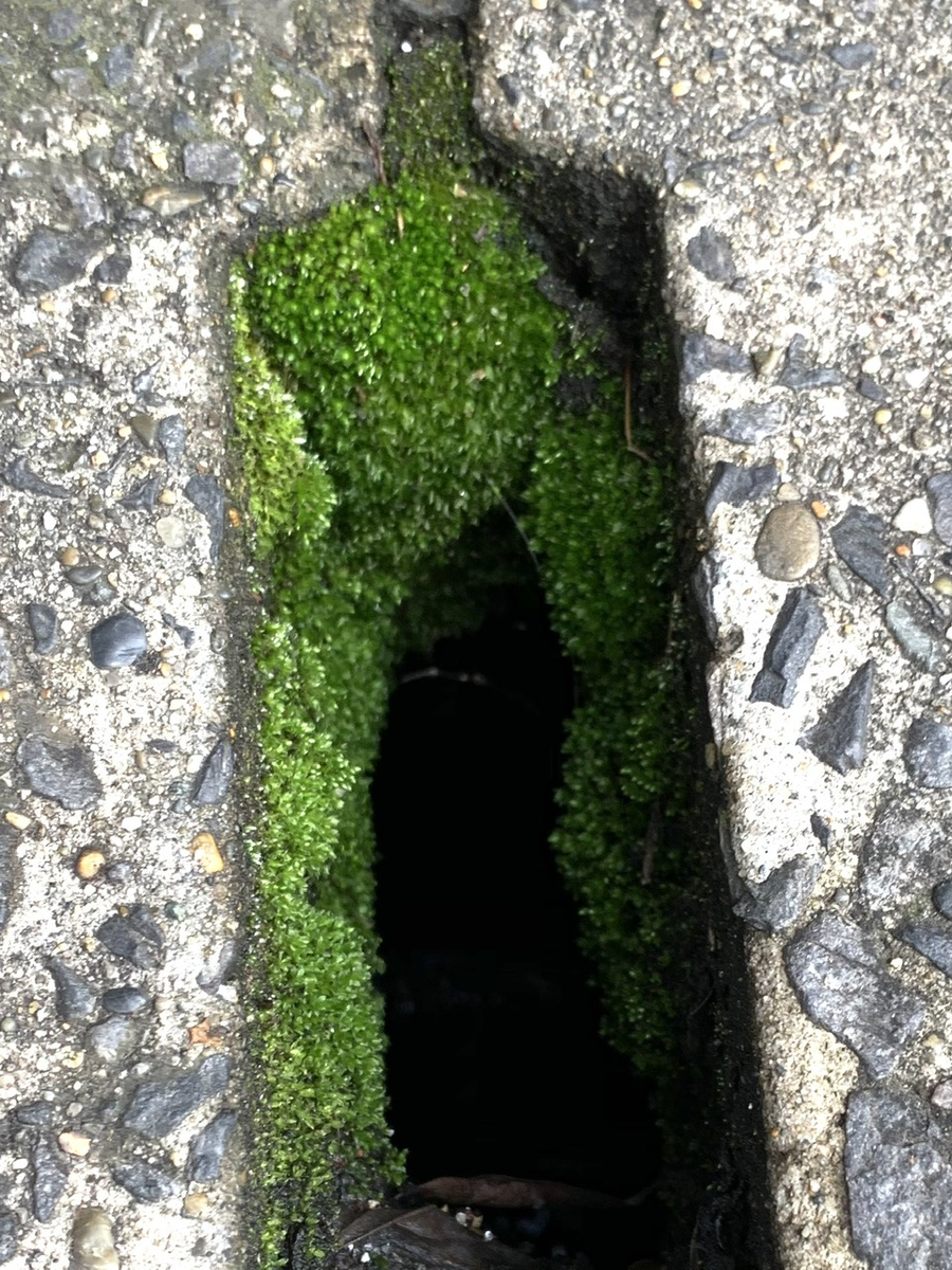 道路の車止めの下に生えた苔です。車止めやポールなどで動線の切れたエリアには、苔がよく現れます。