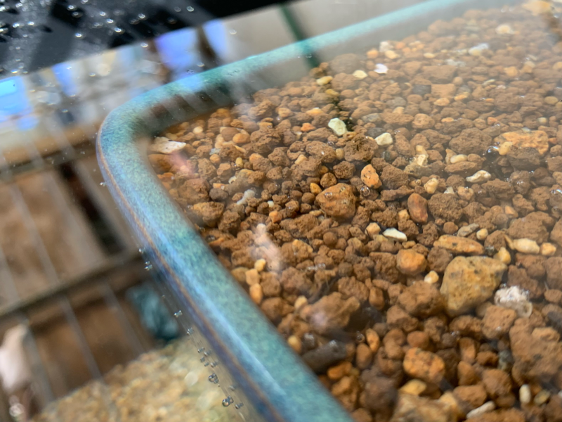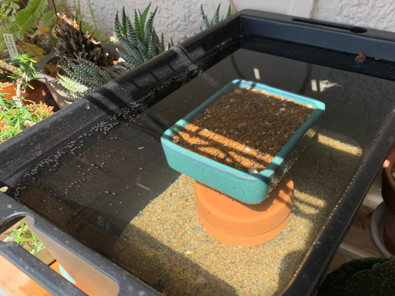 2024-03-30 水底 ビオトープ ささやかなビオトープを作った。容器の容量は8リットル。 水と土だけを入れてある。生き物が外から来るのを待つタイプのビオトープにした。 土入り植木鉢を置いて浅瀬にした。 異なる環境が隣り合う中間地帯のことをエコトーンと言う。浅瀬は陸と水のエコトーンだ。ビオトープに生き物を呼ぶにはエコトーンの造成が重要なのだと言う。 水を通して見る底土はとてもきれいだ。空気と水とで何故これほど見え方が変わるのか分からない。この水底だけでビオトープを作った甲斐があると思える。